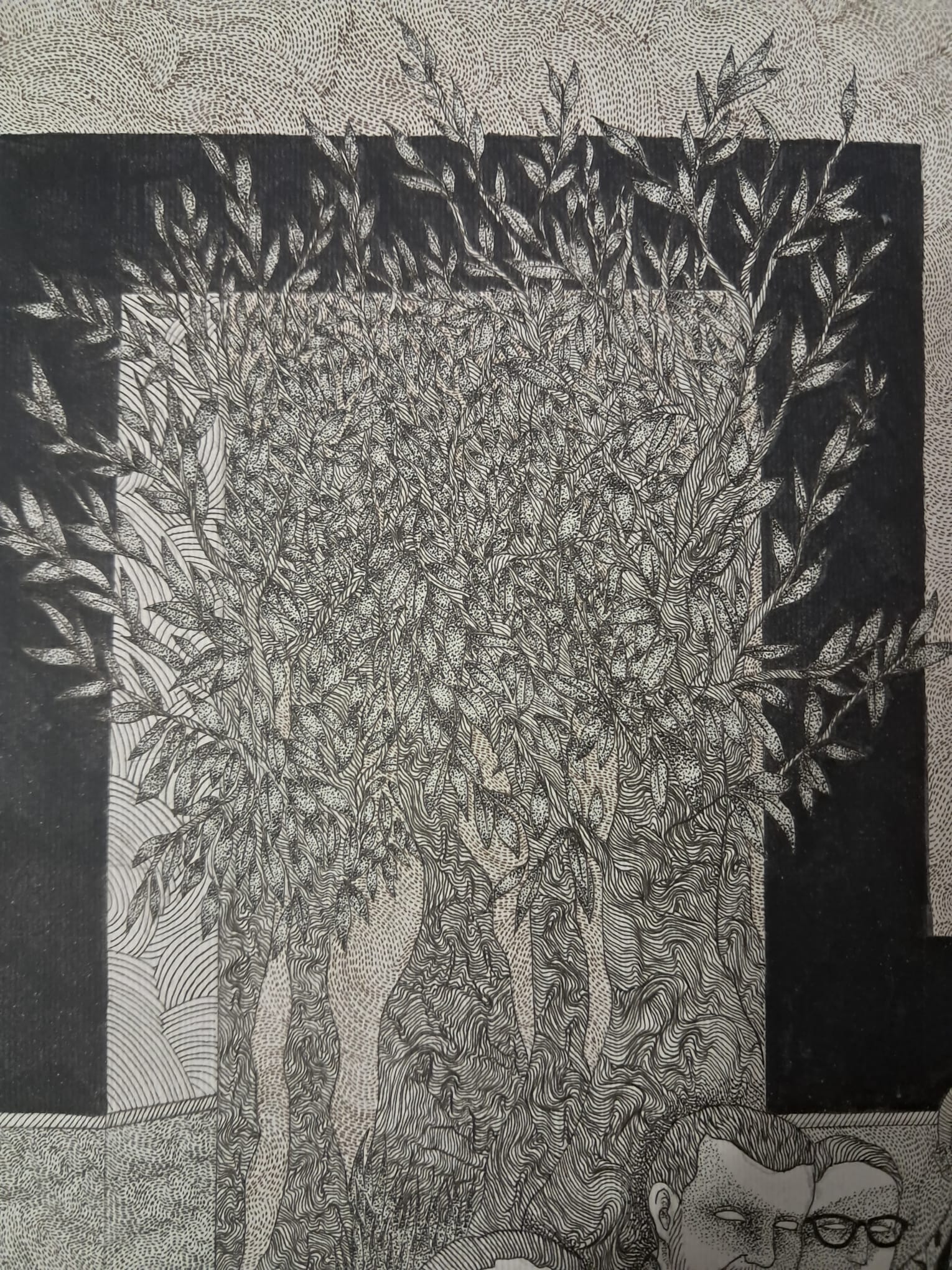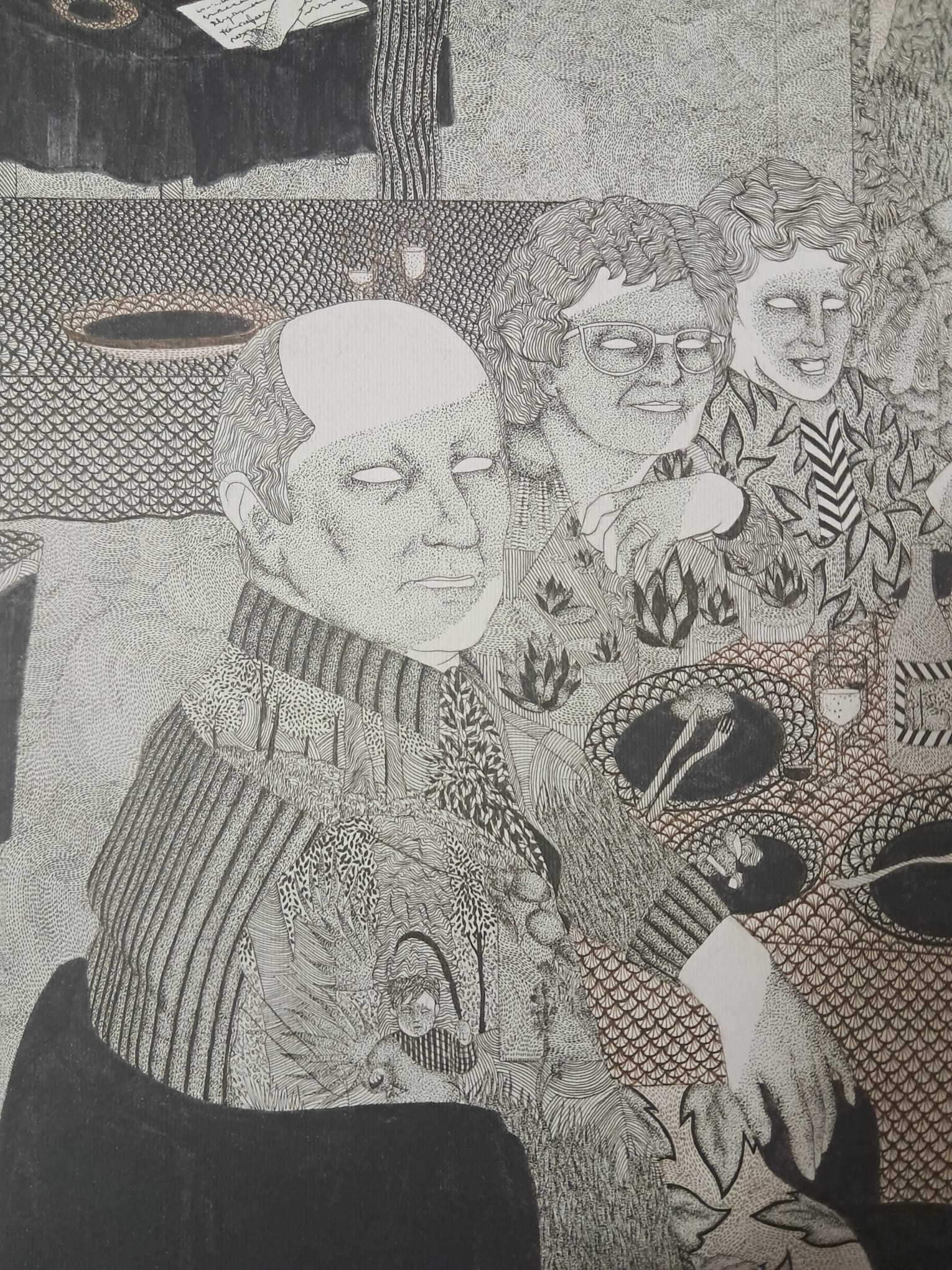 Il segno a inchiostro, minuzioso e reiterato, diventa uno strumento di rallentamento e di resistenza. Attraverso la ripetizione, l'immagine si addensa e trattiene lo sguardo, rendendo percepibile ciò che normalmente resta latente. In questo spazio sospeso, il singolo si dissolve nel gruppo e il gruppo diventa una presenza anonima e persistente, che non agisce ma permane.